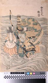 DescriptionWarrior in dress armour, with bow and sword, is seated on a horse amidst water and waves.Status