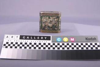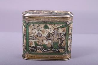 DescriptionOval box is of silver, gilt silver and enamel. Top has a fine low relief carved design of a scholar diverting himself by playing with a large cat-like creature, a low table with lamp and open book to one side. There is some partial gilt against a whitish enamel ground. Top and bottom borders in incised key-fret worked in gilt. The body is in low relief designs of dramatic scenes from an opera with accents in green enamel and gilt against a whitish enamel ground.Status