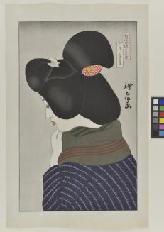 Descriptionportrait in profile of woman in wig and kimono with one hand to her chin.