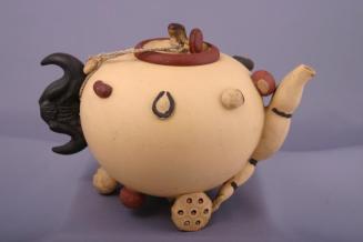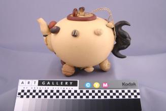 DescriptionSpherical yellow unglazed teapot with three dimensional appliques of brown seeds and nuts on the body as well as for feet on the base. Lid is an upside down mushroom. There is a dark brown, two pronged handle opposite the spout.Colour: yellow;brown