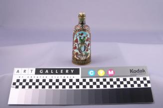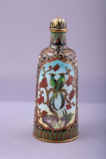 DescriptionStopper and body are cloisonne. Bottle has a straight neck and narrow rounded shoulders that widen out to a flat base. Decoration consist of 2 sections with scenes of birds and flowers surrounded with black and gold scroll-like motif with white flowers.Colour: black;gold;blue;yellow; red;green