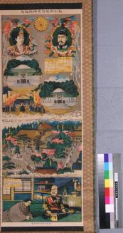 DescriptionPortraits of Emperor and Empress at top with images of architecture and individuals (tombs, shrine and General Nogi) etc. below. Image is in two sections with a horizontal seam at centre.Colour: multi-colour