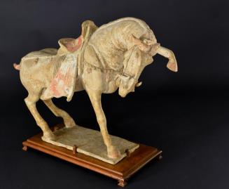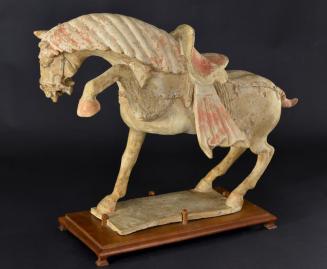 DescriptionStanding figure of prancing horse with left proper leg raised and head bent slightly to R proper. There is saddle on its back. Remains of red paint on saddle, tail, hooves and head harness. Some white paint remains overall. Figure is attached to a wooden base.Status