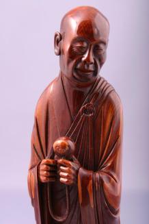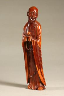 DescriptionFigure is a standing monk with long robe, arms raised at front holding a rosary and a bell, head bare and slightly tilted. It is stained in shades of dark brown.Colour: brown