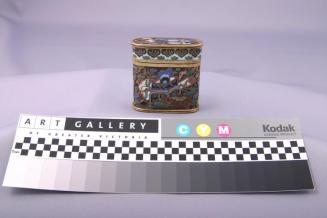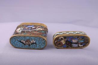 DescriptionLidded oblong box rounded on 2 sides with a deep fittiing lid and decorated overall in cloisonne "hundred Antiques" pattern ie. objects from "the scholars desk: a bronze censer flanked by finger citrons on the lid, and a brush pot with pens, bronze centers in archaistic style and vases with flowers on the body of the box with flower and cloud scrolls forming the background". There is a bat design on the baseStatus