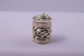 DescriptionCylincrical shaped box with fitted lid. Highly raised relief of frog with some enamel, on lid. Sides of the box have a raised relief of birds and flowers with a green enamel background. Lower lid and lower body of box have a band of twisted wires and a band of incised key frets.Status