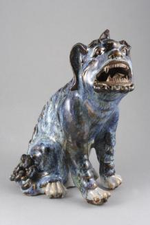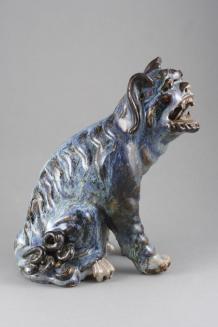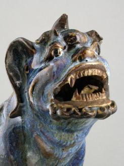 DescriptionSeated Qilin with predominantly blue glaze on body with white feet and belly; open mouth and perforations in earsColour: blue;white