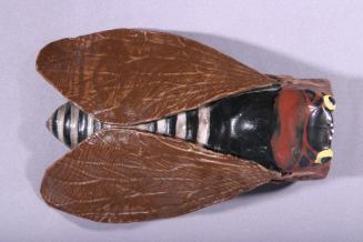 DescriptionFly shaped vase with body being hollow and open at one end with a perforation au verso. Two wings on front, small yellow eyes and a striped abdomen.Colour: brown;black;yellow