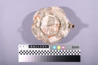 DescriptionLobed teapot in tapestry marbled clay in browns, tan and greys, with scattered enamelled flower designs in white and gold with yellow butterfly as knob. There are two loops for handle attachmentColour: browns;tan; grey;white;yellow