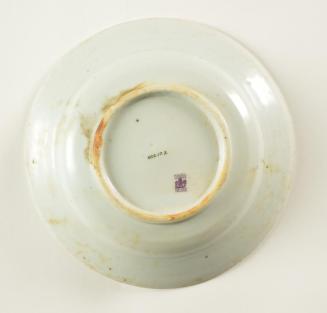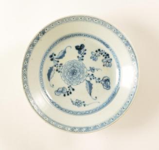DescriptionCircular dish with central circular indentation decoratied with a peony and other smaller botanical details.Status