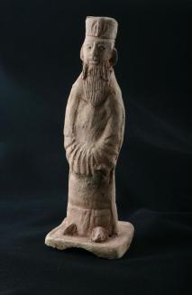 DescriptionFigurine of a bearded court official wearing a hat and with hands clasped together inside the robe sleeves at front.Status