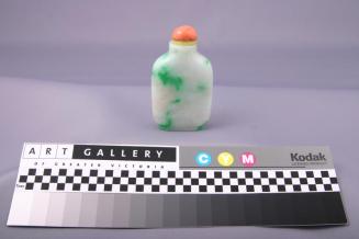 DescriptionBottle is a flattened rectangular shape with rounded shoulders, a short straight neck and a small foot. It is predominantly white with large green inclusions. The stopper is rounded coral resting on a ring of yellow stone.Colour: white;green;yellow;orange