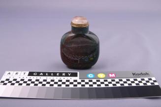 DescriptionRounded squarish shaped bottle flattened on 2 sides. There is a small foot on the base. The agate has red, green and bluish colourations throughout. Clear rounded stone stopper on brass base.Colour: red;green;blue