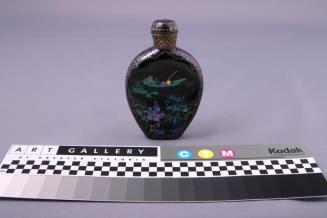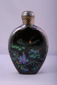 DescriptionBottle is flattened on 2 sides with rounded shoulders tapering into a small base. Cloisonne decoration on one side depicts a scene of figures on a bridge with water lilies and a boat in the background. The other side has a scene with a bird amidst peony branches and fish in the foreground. Background colour is black with decoration in blues, purples, and gold. Bottle has a straight neck with a metal neck edge. Stopper is also cloisonne with metal edge.Colour: black