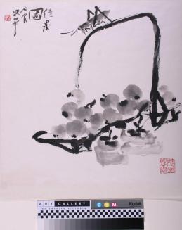 DescriptionBlack and white image of a basket of fruit with grasshopper on handleColour: black; white