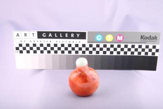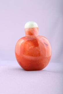 DescriptionHighly polished orange agate bottle has a flattened round body and straight neck. Rounded stopper is pale green jadeite.Colour: orange;green