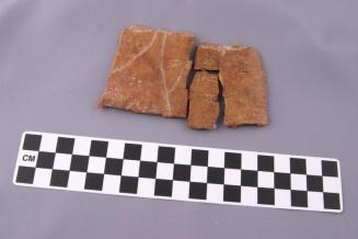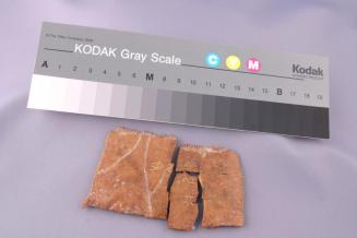 DescriptionThis consists of 3 pieces of oracle bone that fit together to form a rectangle; natural indentations on one surface, incised Chinese characters on the other smooth surface.Status