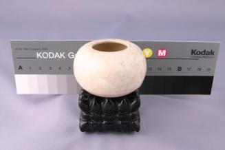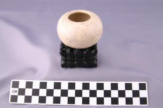 DescriptionSmall round vase with circular opening and no foot. There is a white buff glaze on the interior and the exterior down to within .5 cm of base. Incised ring near base.Status