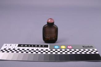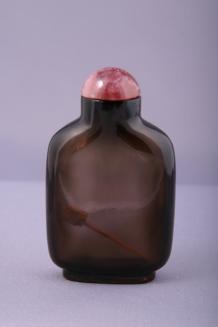 DescriptionThis is a plain rectangular shaped bottle with rounded shoulders and sides and a small straight foot and straight neck. Body material is brownish smokey quartz. The stopper is rounded and made of a pinkish crystalline stoneStatus