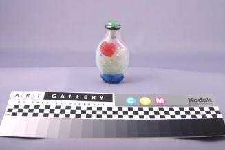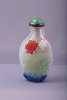 DescriptionOval shaped bottle with narrow depth and straight neck. Bottle is clear to milky coloured with an overlay of red and white chrysanthemums with green stems and blue decorative design at base. Stopper is metal with a green jadeite rounded top.Colour: clear;blue;green;red;white;