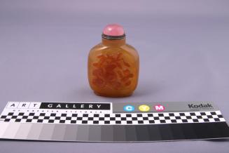 DescriptionRounded square shaped bottle in yellowish agate with darker brown relief carving on one side depicting a vase with greenery, a bird and a piece of fruit. Stopper is a rounded pink stone resting on a metal base.Colour: yellow;brown;pink