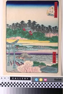 DescriptionCity scene with buildings,large arch, cherry trees in blossoms and people with umbrellas.Colour: multi-colour