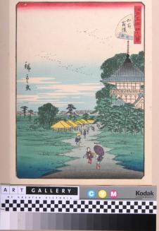 DescriptionFigures in kimonas walking on path with tall building with spire on the roof and yellow roofed pavillions in the background.Colour: multi-coloured