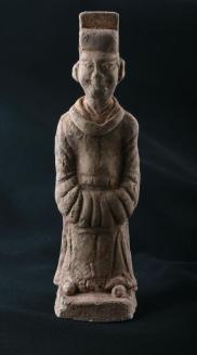 DescriptionFigurine of a standing court official with hands clasped together inside the robe sleeves at front.Status
