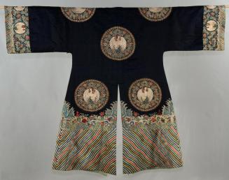 DescriptionWoman's navy blue silk coat has eight roundels embroidered in coloured silk floss, depicting cranes carrying peaches (lishui) surrounded by stylized clouds and a repeating swastika pattern. At the bottom of the surcoat are multicoloured diagonal bands of colour with various symbolic objects throughout the stylized waves. There are matching complimentary bands and crane motifs on the sleeve cuffs. All of the embroidered elements have couched gold-wrapped threads. The coat has five silk cord fasteners down the centre of the garment, and is lightly padded and quilted. The garment is lined with a light blue silk damask.Colour: blue, beige, red, brown, green, purple, gold