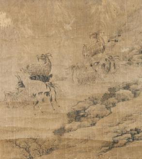 DescriptionTwo ink paintings were originally album leaves, now mounted on a single hanging scroll. 1: image of a large pine tree on the left and top, with two conversing scholars to the right. There are green, red and blue details. .2: image of a herd of long haired goats (8) in a landscape scene with small details in green and red.Status