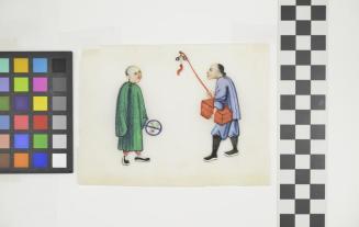 DescriptionScene with two figures; a man in green at left carrying a circular object and a man in black at right carrying a box and a long rod with a tassel at the end;Colour: multi-colour