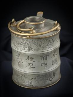 DescriptionWine warmer is a cylindrical shape with an outer housing for the hot water and an inner lidded wine pot with a small spout that protrudes out at the top of the assembled piece. Each section has a brass handle on the top that attaches to two rounded elements with loops. There is a band of brass edging on the top of both sections as well as at the bottom of the outer section. The outer section is separated into three decorative bands by two ridges with incised lines. Bands are incised with Chinese characters, landcape scene, boat, flowers, bird and pine branches.Status