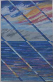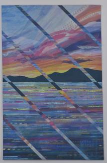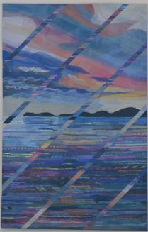 Descriptionabstracted seascape with strips of coloured fabric in blues, whites, pinks, pale orange, and metallics depicting sky, mountains, and water; diagonal blue bars overtop; enclosed in netting with zig zag diagonal stitching;Status