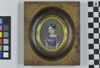 Descriptionminiature oval portrait (head and upper body) of a young girl in a purple dress on a green background; housed in a square wooden frame with an inner brass oval at centre;Status