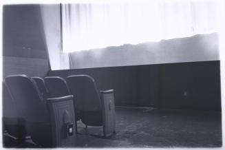 DescriptionImage of a partial row of theatre seats at the left in front of a stage with a luminous curtain half raised.