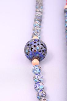 DescriptionNecklace consists of: 108 metal beads with blue enamel; 10 large blue enamel beads; 10 coral beads; 5 pearls; 3 short strands of green glass and enamel beads (30 beads in total); 5 metal discs; ribbon and cordColour: blue;green;red;coral