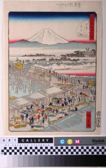 DescriptionCity marketplace scene with people, a bridge and Fujiyama with snow in backgound.Colour: multicolour