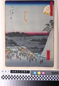 DescriptionNight scene with fireworks in the sky and groups of people and kiosks in foregroundColour: grey;yellow;red;blue