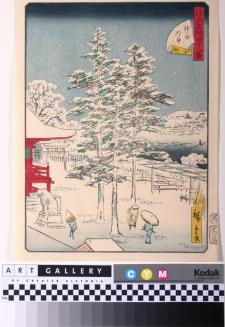 DescriptionWinter scene with snow, pine trees, figures with umbrellas, statue and building in foreground.Colour: blue;green;red;yellow