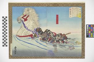 Descriptiondiptych; "Shinsen Taikoki" Akechi Samanokami Mitsuharu is crossing a lake with his famous horse, Okage, from Uchide Beach in Otsu to Karasaki Beach. (He and his 3000 men are trying to eradicate the troop of Hori Hidemasa of Azuchi) There is a brocade-like decorative border around the image.Colour: multi-coloured