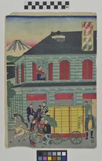 Descriptionprint depicts a western style building with a horse drawn carriage in front on the street; people can be seen on the interior of the building; pedestrians on the street; Mount Fuji is in the background;Status
