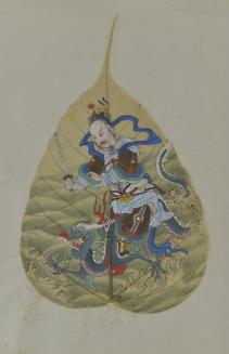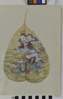 DescriptionChinese export painting; image depicts a man holding a sword and riding on a dragon; water and waves beneathStatus