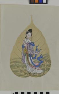 DescriptionChinese export painting; image depicts woman in purple and white robe with a long blue sash, stands in a body of water amid waves;Status