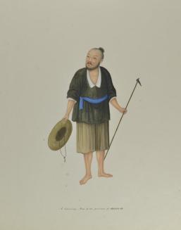 DescriptionChinese export painting; standing portrait of a man wearing a brown skirt, short black jacket with a blue sash, and carrying a long stick-like instrument in his left hand proper and a straw hat in his right.Status