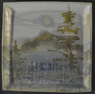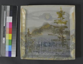 Descriptionrectangular slab built plate with shallow flared sides; glazed landscape scene in wellStatus