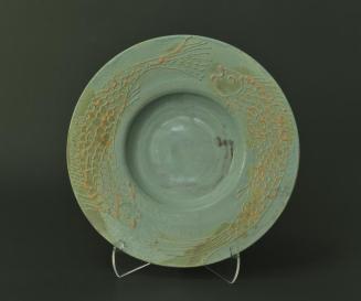 DescriptionLarge circular plate with a steep well and a wide flat rim decorated with slipware fish; overall green glaze with fish details in brownsStatus