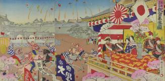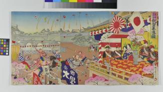 Descriptiontriptych; print depicts an Emperor seated on a dais with family and officials watching a polo match; numerous flags and banners decorate the area;Status