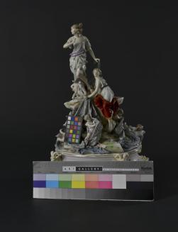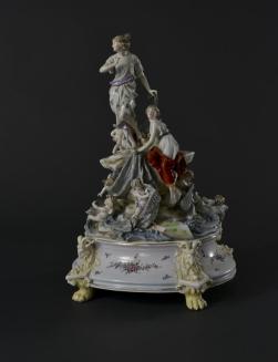 Descriptiona large figure group resting on an oval base raised on four claw feet with rams head supports; there are larger female figures in a landscape with six cupids; waves, fish and drapery embellishments;Status