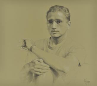 Descriptionblack and white portrait of Vancouver aids activist Dr. Peter Jepson-Young (Dr. Peter Foundation); seated pose includes head, upper torso, arms, and upper portion of one knee