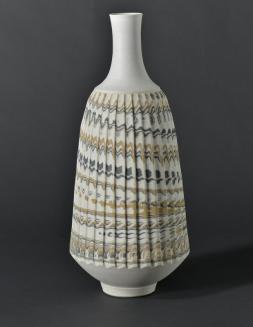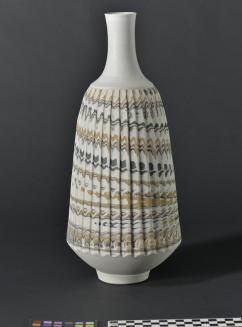 Descriptionvase is cylindrical, tapering slightly towards the shoulders, with a narrow slightly flared white-glazed neck and a small recessed foot in unglazed white; body is fluted vertically with an exposed lineal pattern in 3 colours of brown and grey; (see artist comment for technique)Status